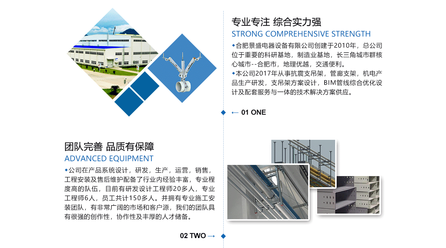 合肥景盛電器設(shè)備有限公司創(chuàng)建于2011年,注冊資本3000萬,總公司位于中國重要的科研基地,制造業(yè)基地,長三角城市群中心城市-----合肥市,地理位置好,交通方便。本公司2017年從事抗震支吊架,電纜橋架,機(jī)電產(chǎn)品生產(chǎn)研發(fā),支吊架方案設(shè)計(jì),BIM管線綜合優(yōu)化設(shè)計(jì)及配套服務(wù)與一體的技術(shù)解決方案供應(yīng)。公司在產(chǎn)品系統(tǒng)設(shè)計(jì),研發(fā),生產(chǎn),運(yùn)營,銷售,工程安裝及售后維護(hù)配備了行業(yè)內(nèi)經(jīng)驗(yàn)豐富,服務(wù)程度高的隊(duì)伍,目前有研發(fā)設(shè)計(jì)工程師20多人,工程師6人,員工共計(jì)150多人。并擁有施工安裝團(tuán)隊(duì),有非常廣闊的市場和客戶源,我們的團(tuán)隊(duì)具有很強(qiáng)的創(chuàng)作性,協(xié)作性及豐厚的人才儲備。 公司先后通過ISO9001:2015質(zhì)量管理體系認(rèn)證...